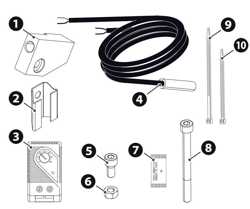 КОМПЛЕКТ ПОСТАВКИ: Суппорт картриджа термостата Суппорт термостата Термостат Картридж термостата с кабелем электропитания Винт с цилиндрической головкой M8x16 Гайка М8 Термопаста Винт с цилиндрической головкой M8x90 Хомут для крепления кабелей 360 x 4, 7 Хомут для крепления кабелей 125 x 4 ТЕХНИЧЕСКИЕ ХАРАКТЕРИСТИКИ: Напряжение электропитания 230В 50 Гц Мощность 50 Вт Макс. потребляемый ток 0.2 А Вес (кг) 0.46