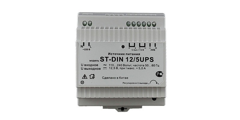 ST-DIN 12/5UPS, Стабилизированный источник питания на DIN-рейке с функцией подключения АКБ для питания аппаратуры напряжением 12В, Ток нагрузки рабочий/максимальный: 5, 0А, Мощность по цепи нагрузки 12 Вольт (при максимальном выходном токе: 60Вт, Выходное напряжение, номинальное: 12, 5В, Максимальный ток заряда АКБ: 0, 7А, Ток ограничения выхода при коротком замыкании нагрузки: >6, 0А, Защита выхода от КЗ с восстановлением нормального режима работы после устранения проблемы, защита АКБ от глубокого разряда, регулировка выходного напряжения, Емкость АКБ: рекомендуемая емкость подключаемого АКБ (напряжением 12 Вольт с электрической емкостью 7 или 12 А/ч), Пластик, Температура эксплуатации: -10...+45°C