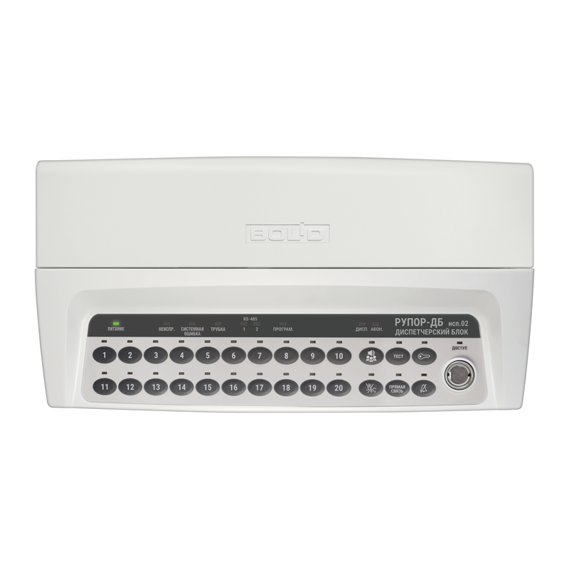 Блок «Рупор-ДБ исп.02» является частью адресного блочно-модульного прибора пожарного управления (ППУ) по ГОСТ 53325-2012 п.7.2.6 и предназначен для обеспечения двунаправленных каналов связи зон пожарного оповещения с помещением пожарного поста.